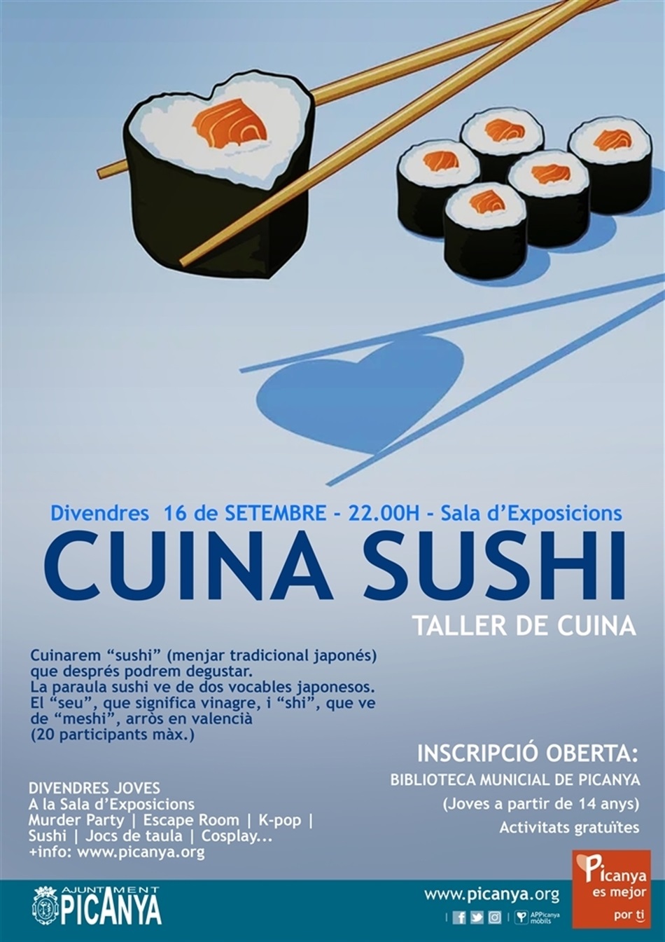 Este proper divendres 16 setembre tindrà lloc el taller de CUINA SUSHI. Cuinarem “sushi” (menjar tradicional japonés) que després podrem degustar i segur que t’encantarà